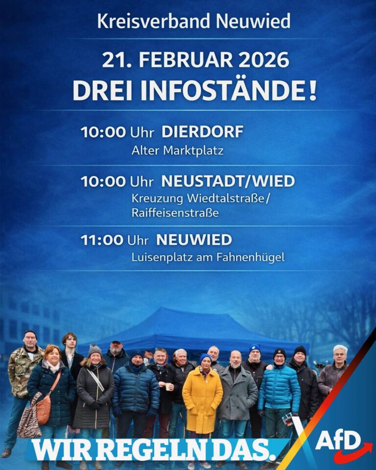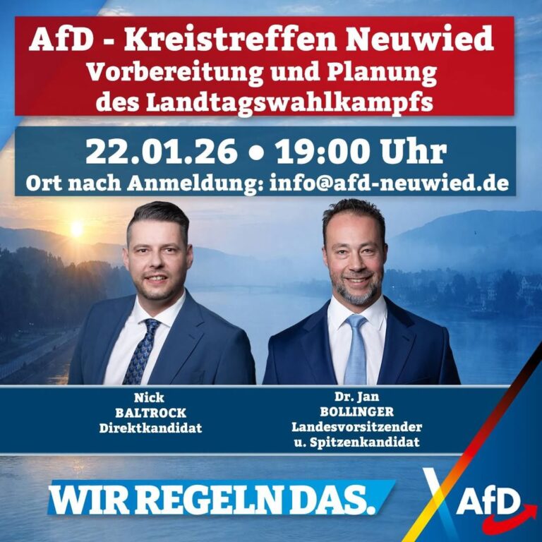 Januar 15, 2026Kreistreffen zum Landtagswahlkampf mit den Landtagskandidaten Dr. Jan Bollinger und Nick Baltrock. Anmeldung unter info@afd-neuwied.de