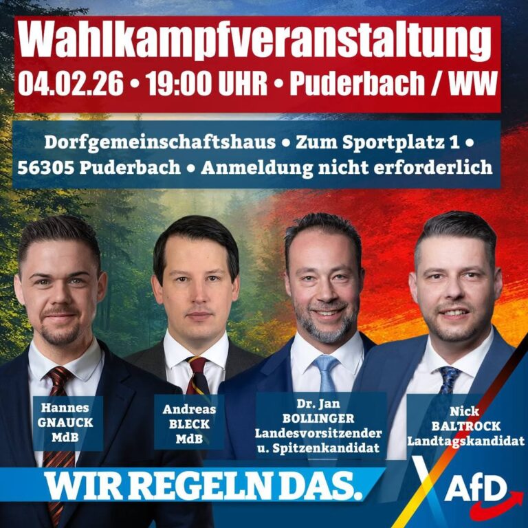 Februar 3, 2026Am 04.02.2026 laden wir zur Wahlkampfveranstaltung in Puderbach mit unserem Spitzenkandidaten zur Landtagswahl Dr. Jan Bollinger, unserem Bundesvorstandsmitglied …